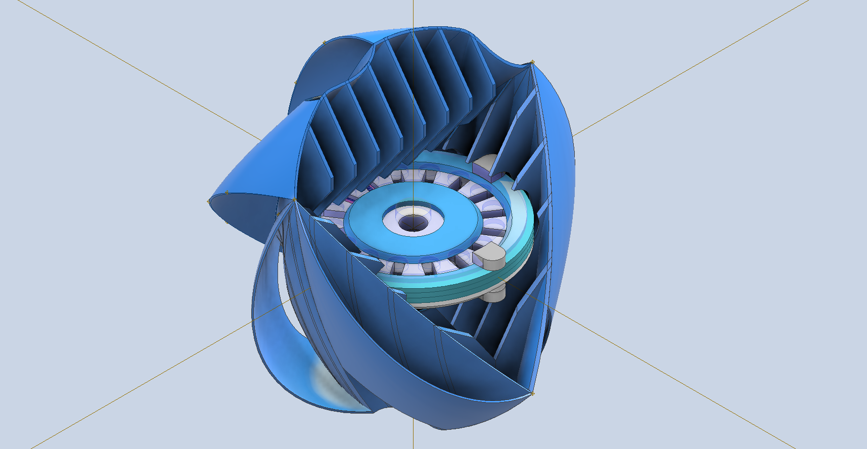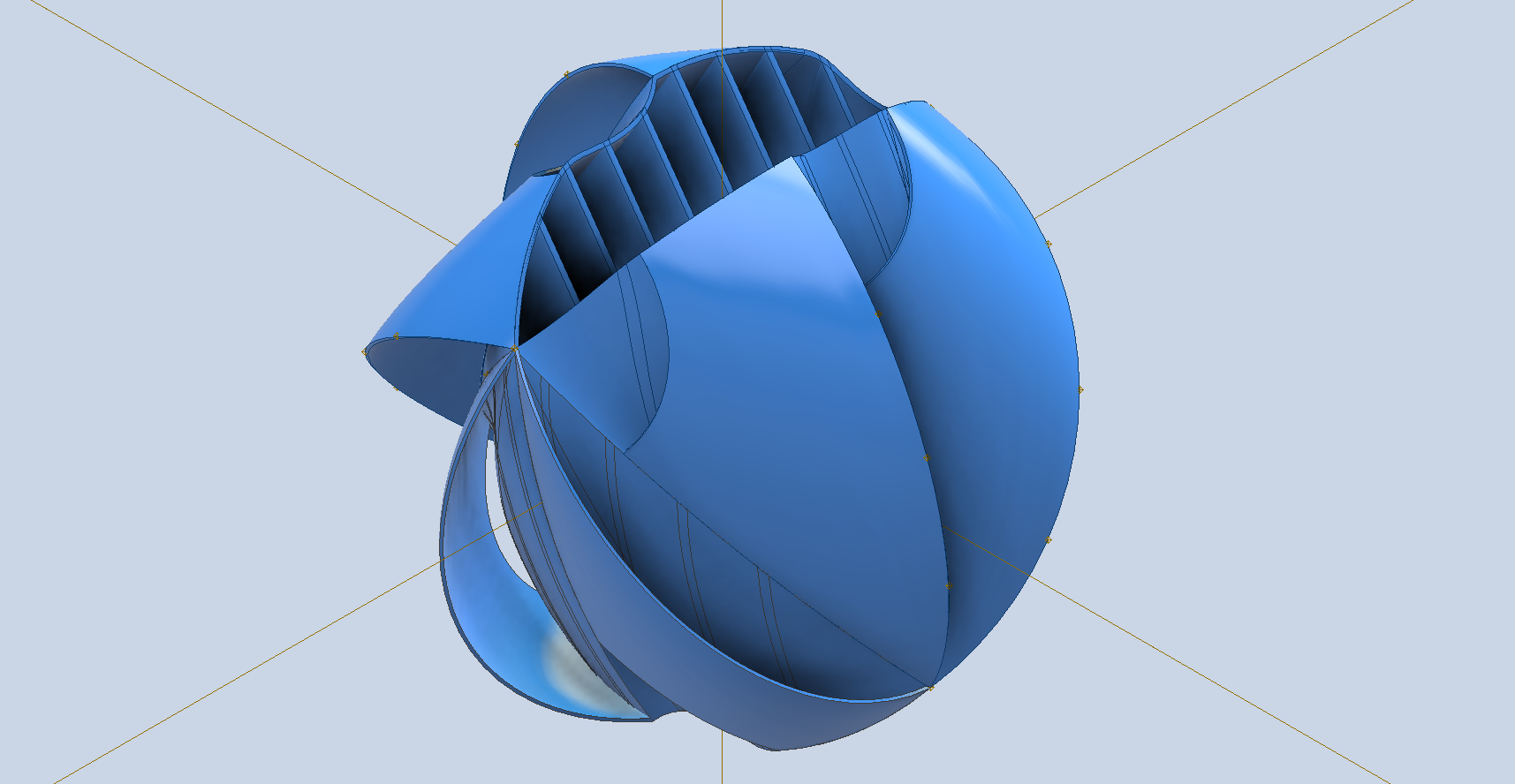 Once that is all done, you should end up with something similar to the above. I have shown a shaft through the vertical centre for reference. As mentioned earlier, this is just my interpretation of how a spherical wind turbine could be constructed.
