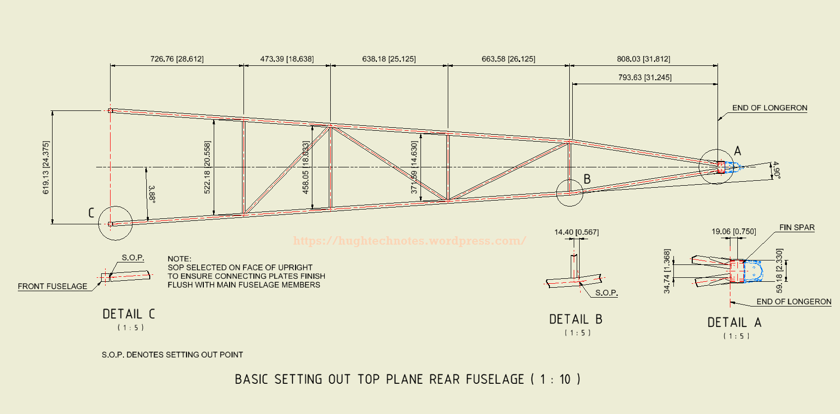 The archive drawings suggest that the setting out point between the front fuselage and rear fuselage members is coincident on the centre line. However this would not facilitate a flush connection with the bent plate connector, so I have offset the SOP to the face of the front fuselage upright, which does. Notice too the minor adjustment to the angles.
