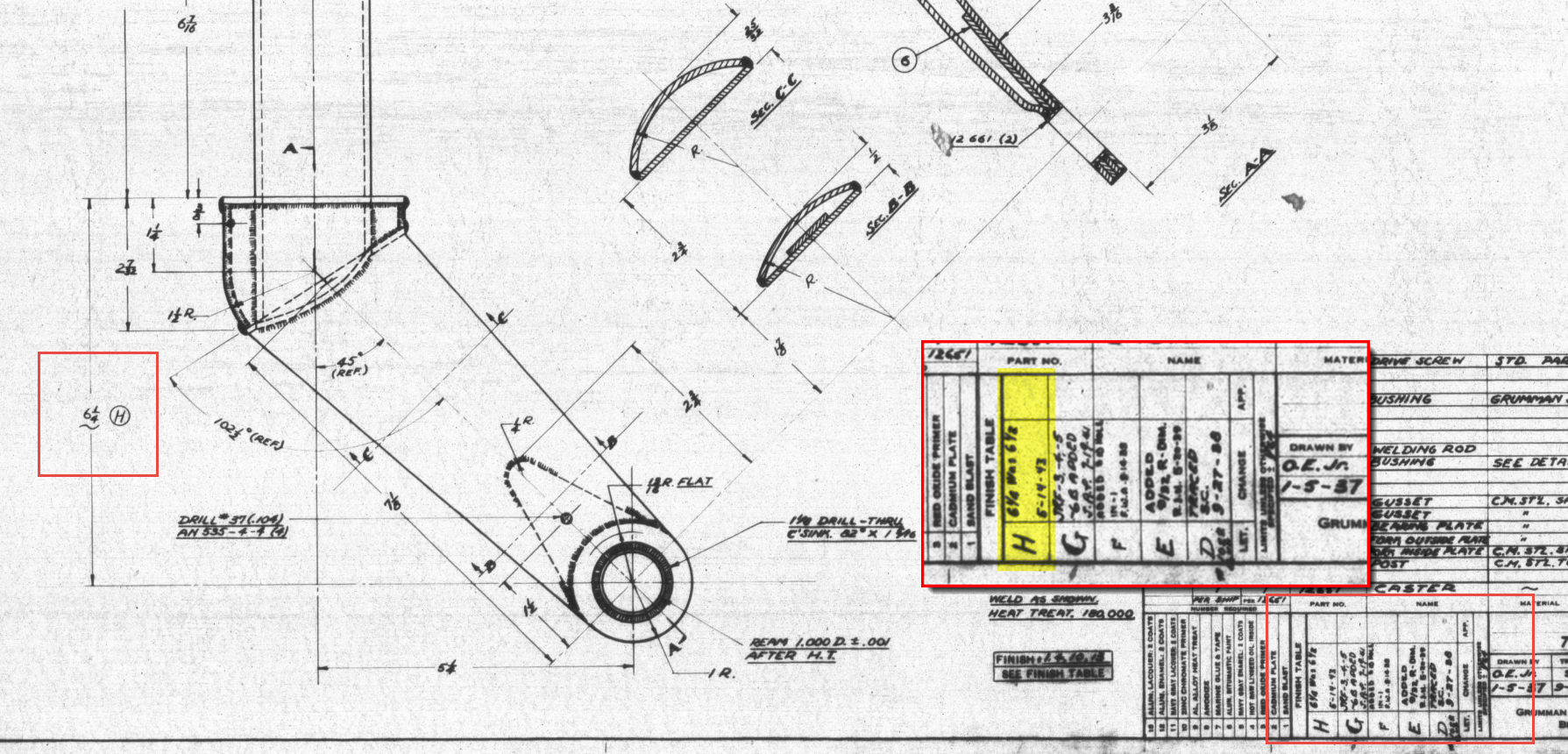 I have intentionally highlighted the revision box to indicate Revision H. This revision specifically documents the change in dimension from 6.5 inches to 6.25 inches. If we examine the other dimensions, the blueprint specifies that the centre axis for the fork should be set at a 45-degree angle. Additionally, the key setting out dimension is 5.25 inches, measured horizontally to the intersection of the vertical axis and the centre of a 1.25-inch radius.