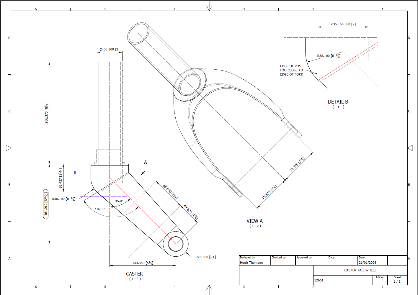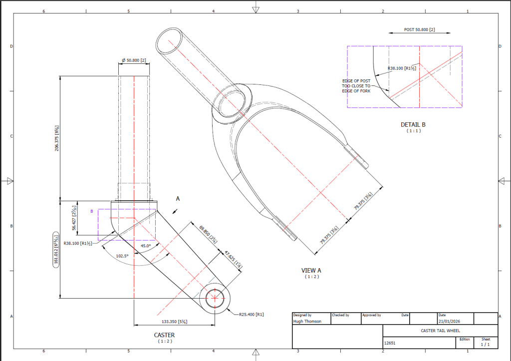This immediately rings an alarm bell…to achieve a 45 degree fork with the dimensions shown, you would expect that 6.5 inches is in fact correct and that in this case the 6.25 inch is not. But yet it was the only purpose in this revision to record a change to 6.25 inches.
