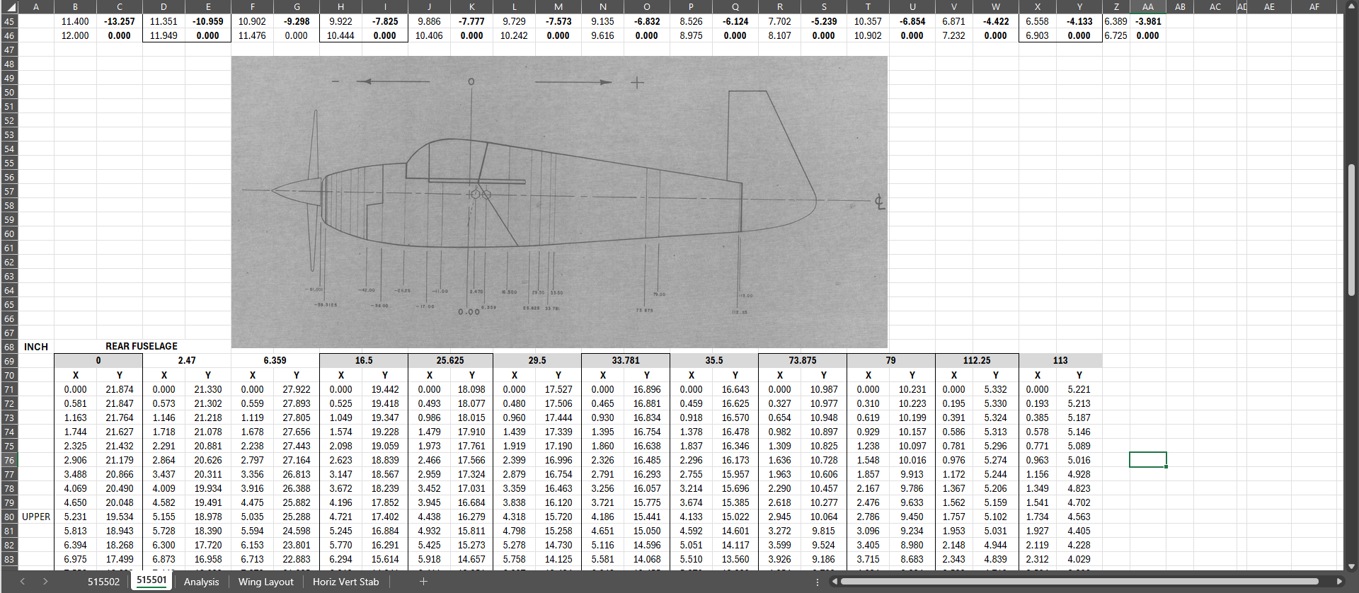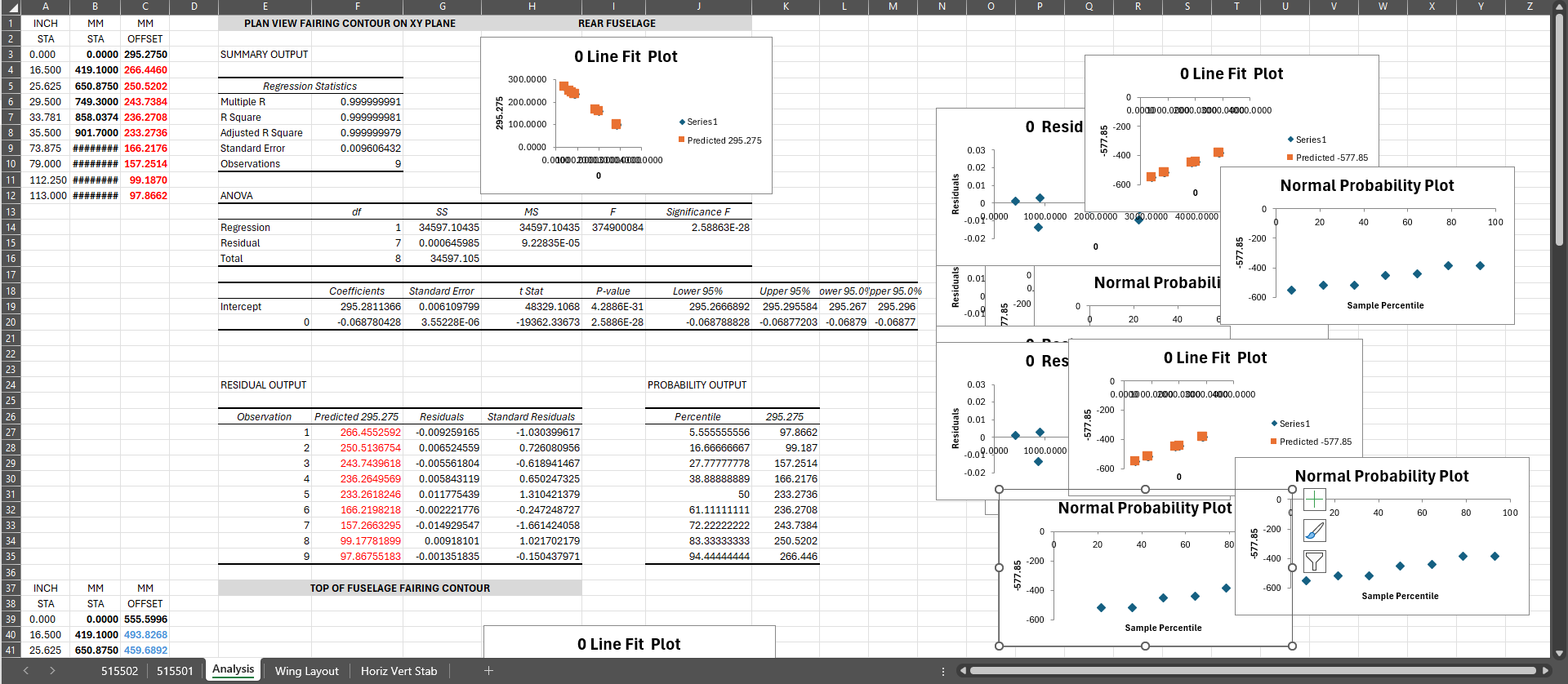 As usual, I entered all known blueprint ordinate dimensions into a spreadsheet, and this time, I extrapolated the dimensions for the fairing lines: top, bottom, left, and right. These were then used as the dataset for a regression analysis in Excel to determine the best-fit line.