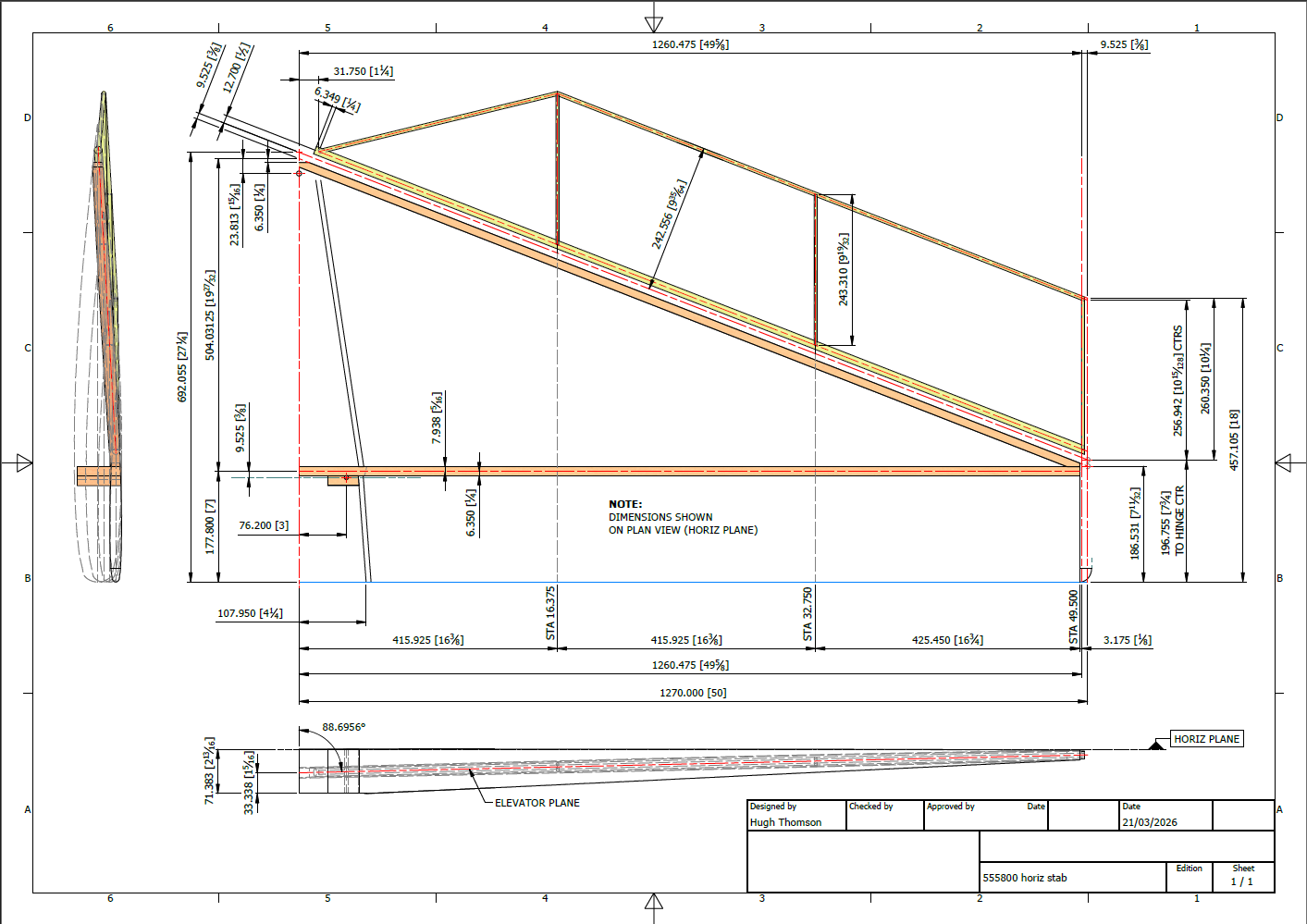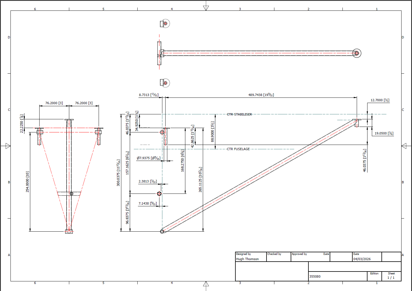 In the images above, you can see the partially modelled diagonal frame that supports the entire empennage. Interestingly, the entire assembly is secured with just three bolts. On top of this frame, there is a fabric-covered tubular structure that essentially forms the tail end of the rear fuselage. To get everything to work correctly, the brackets were sketched out from the Fuselage Bulkhead at Sta 113, the main support frame was partially modelled to locate onto those brackets, and then the Vertical and Horizontal stabilisers were located to the requisite fixing points on this frame. To check the dimensions of the Stabilisers and the frame, I created a few 2D drawings to ensure correctness.