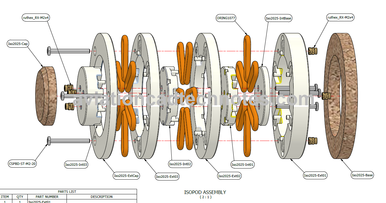The Isopod-2 is made up of four externally stacked rings and four internally stacked rings, all featuring three layers of silicone o-rings. At the top, there is a composite buffer made from rubber and cork, and the base is constructed from a similar material. The development of this final product took over three years, during which various prototypes were created and tested to achieve this design.