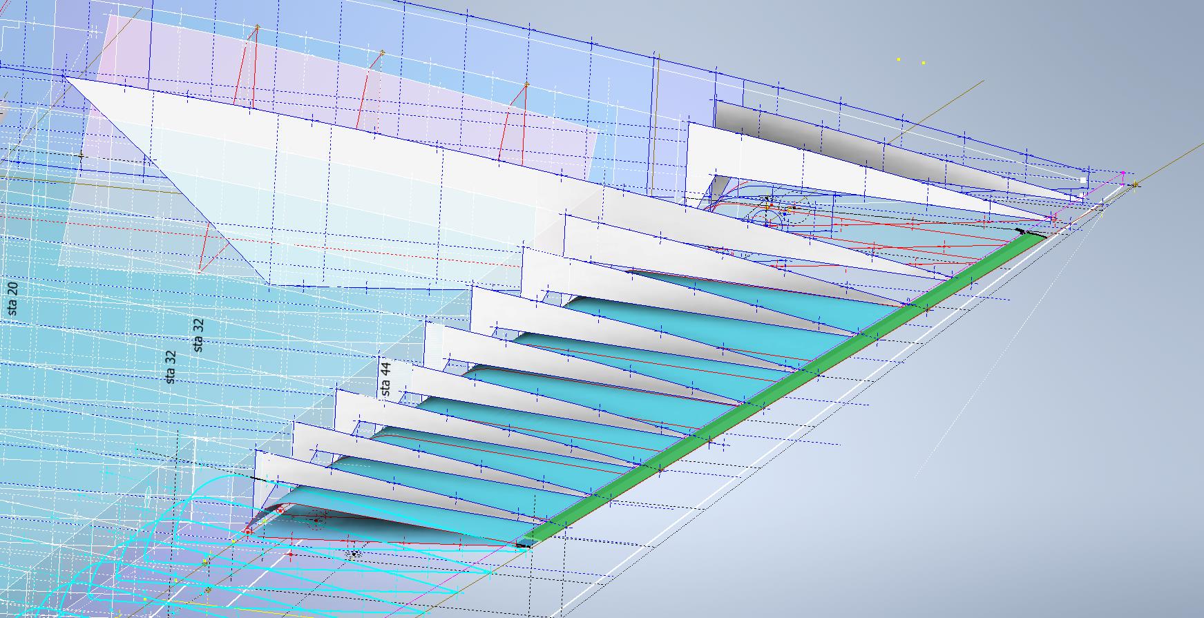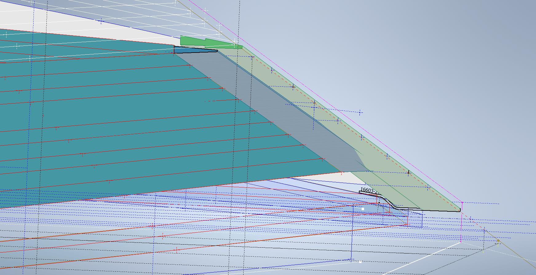 The component shown in green is the Alcoa K14403 standard Grumman profile for the trailing edge. When I developed each of the wing TE profiles (white) there was a minuscule variation in the alignment, so I needed to determine the best-fit line through those points using Linear Regression Analysis. I could just have easily selected 2 random points from the wing TE profiles which would have been okay but I like to get this stuff right.
