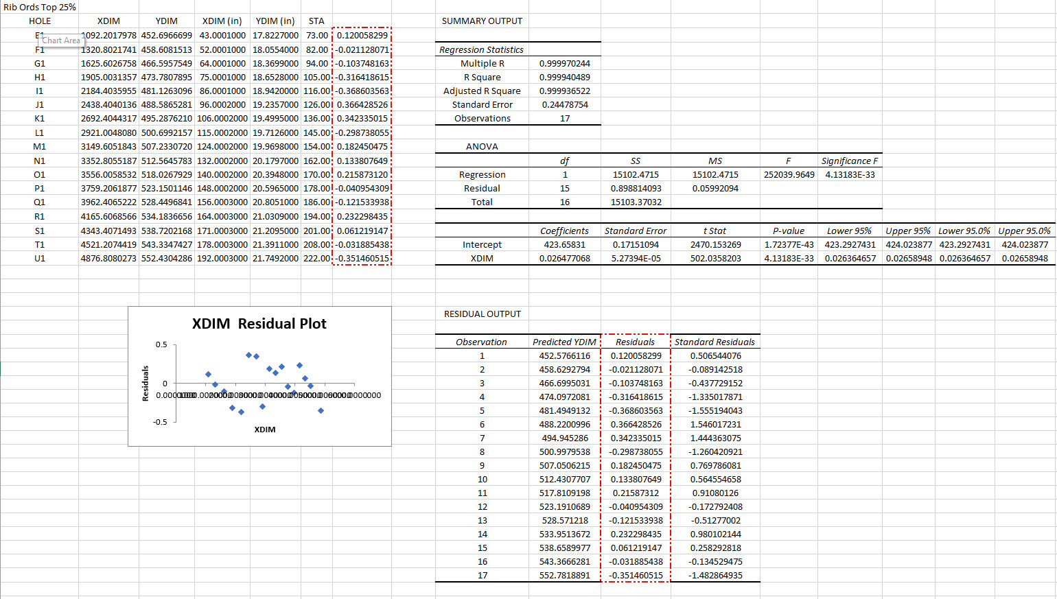 By using Linear Regression there is no guesswork or random selection it simply analyses the point coordinates and calculates a line that best fits all these known points. As we have 11 coordinate points to analyze the end result will be an accurate placement of a Trailing Edge line that represents the collection of known coordinate points. The column named Residuals is the offset from the known coordinates to this line. As you can see the max offsets are in the region of 0.3mm…well within normal fabrication tolerances.