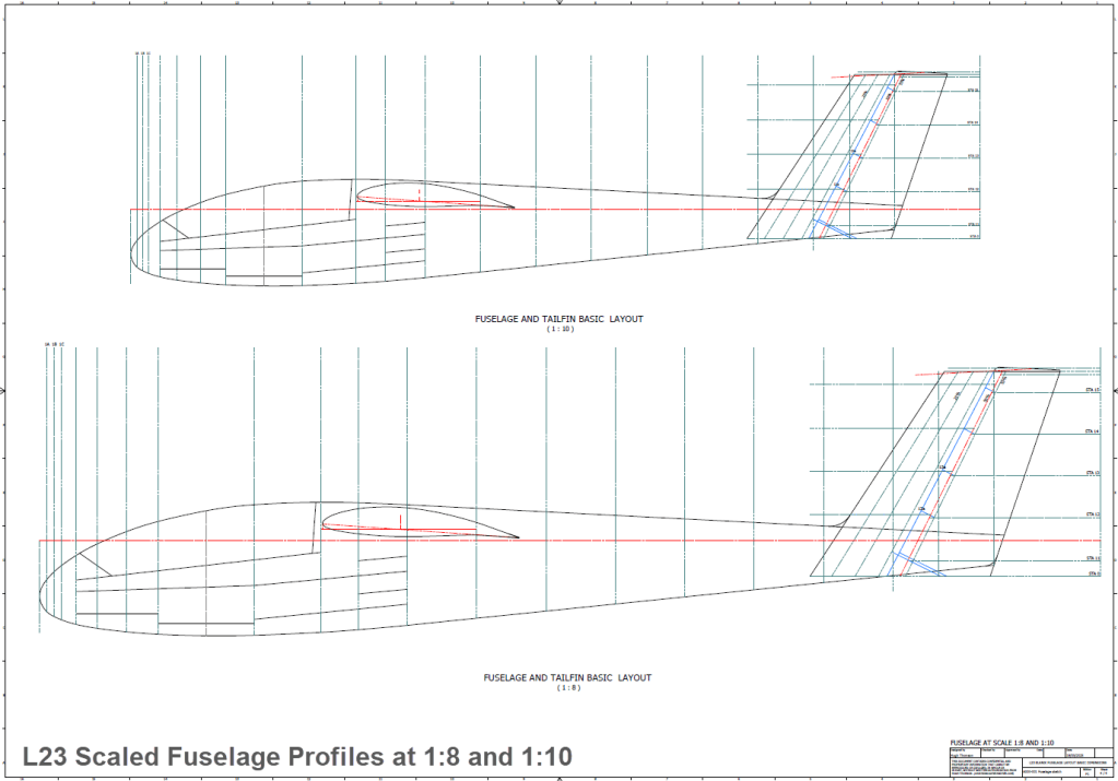 Fully dimensioned layout drawings for the Fuselage, Wings, and Stabilisers also include accurate 2D scaled profiles at 1:8 and 1:10 scales.