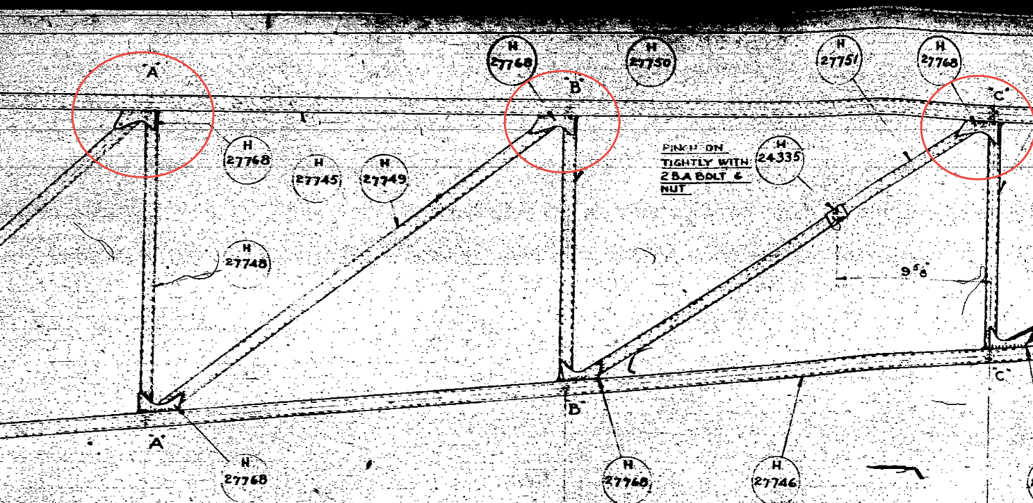 This is a scrap view of the de Havilland rear fuselage drawing on which I have indicated 3 gusset locations. The first thing that comes to mind is that for each joint the diagonal truss member is at a different angle but the gusset plate in each case is the same part number.