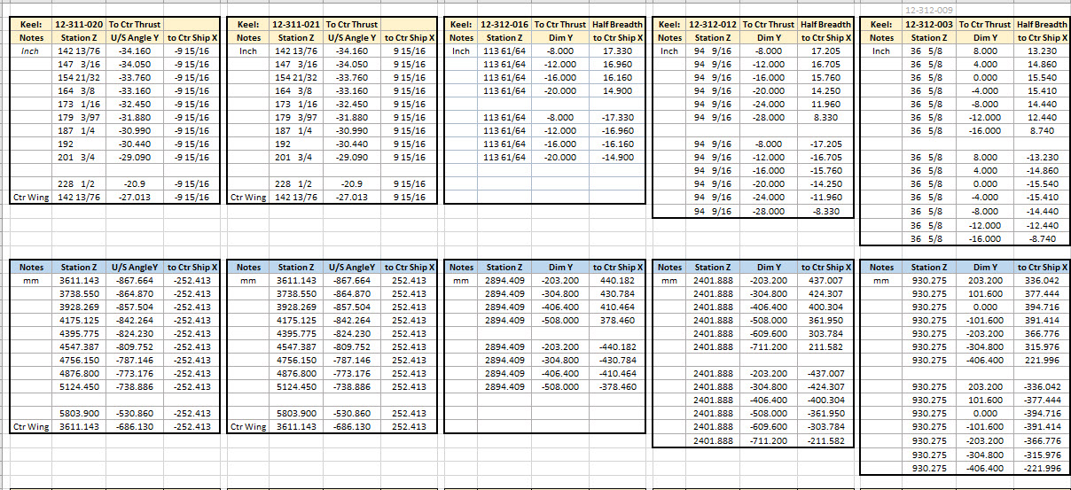 In excel I created this spreadsheet with the Ordinate Table on the left and subsequent tables containing information from the Fin/Rudder Rib drawings. The first 2 columns in each table are the values as noted on the drawings and then to check my theory that they followed a logical sequence I calculated the third column which indeed returned a close approximation of the actual chord length. The fourth column is the new offsets calculated from the derived chord length in each case.