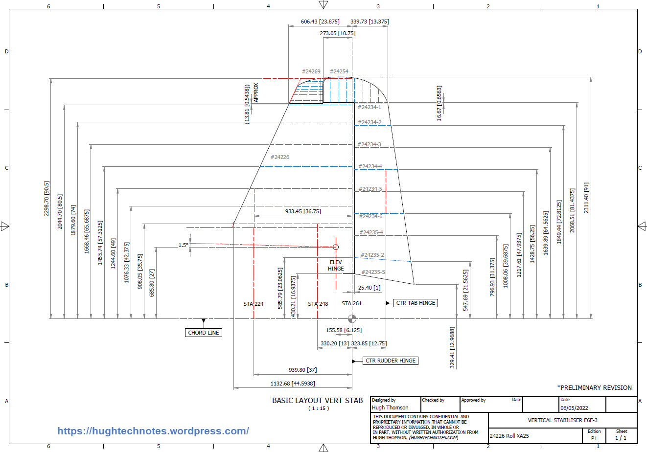 Having worked my way through the vagaries of the wing design and the forward Boom section I then progressed to the Vertical Stabiliser Fin and Rudder drawings. The first drawing in the batch I looked at was an ordinate layout drawing which on closer inspection only provided the location of the spars and struts…there was no information on the Leading or Trailing edge curved profiles. So I ventured to look at Assembly drawing #223026 to see what information I could glean from that.