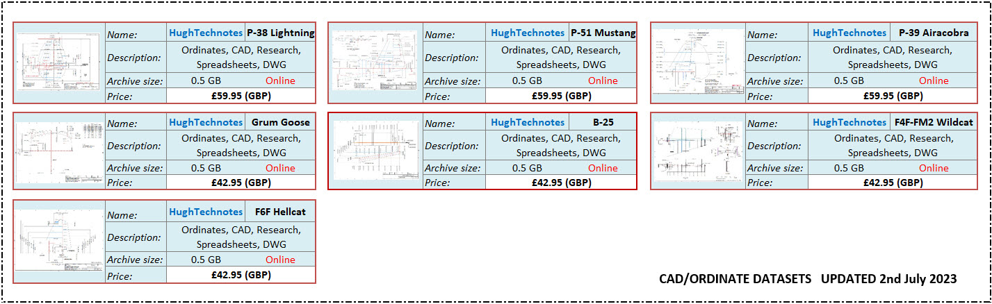 Thousands of ordinate dimensions are recorded in Excel spreadsheets (mm and inch), DWG drawing profiles, DWG fully dimensioned professionally prepared drawings, supporting blueprints and CAD 3D model files (Parasolid, 3d DWG, STP). All spreadsheets are fully editable so you can adapt the data to suit your own requirements. For details on the purchase, just contact me at hughtechnotes@gmail.com.