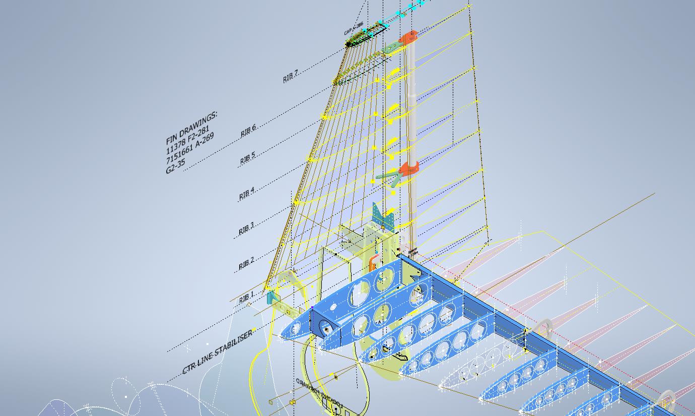 The first image is the Lines Diagram for the Vertical Stabilizer Fin Ribs. In the Table of Offsets, you will notice a list of dimensions from the “Root,” with the first rib specified at 10 7/8 inches. If we overlay these dimensions onto the CAD drawing, we observe a 1/16-inch discrepancy to the top of the first rib. However, all other sources, including those mentioned above and additional references not listed, such as the fuselage Lines layout, indicate that the top of the rib is correctly positioned in the CAD model (second image), contradicting the information provided in this Table of Offsets.