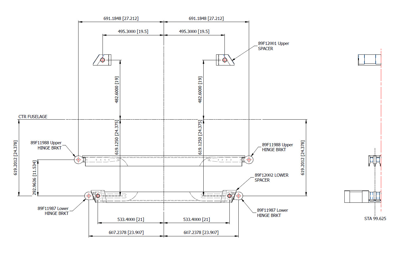 I am looking to verify the dimensions and locations of the rudder ribs and hinges in relation to the Fuselage Reference Line. To accomplish this, we will start with the information we have and determine what additional information we need. The first image confirms that the CAD drawings for the rudder accurately depict the positions of the hinges. The second drawing further supports this; the “Top of Rib” location refers to the lower rib of the fin which includes the locations of the hinge centers. At this point, we have established the correct locations of the rudder hinges from two different sources.