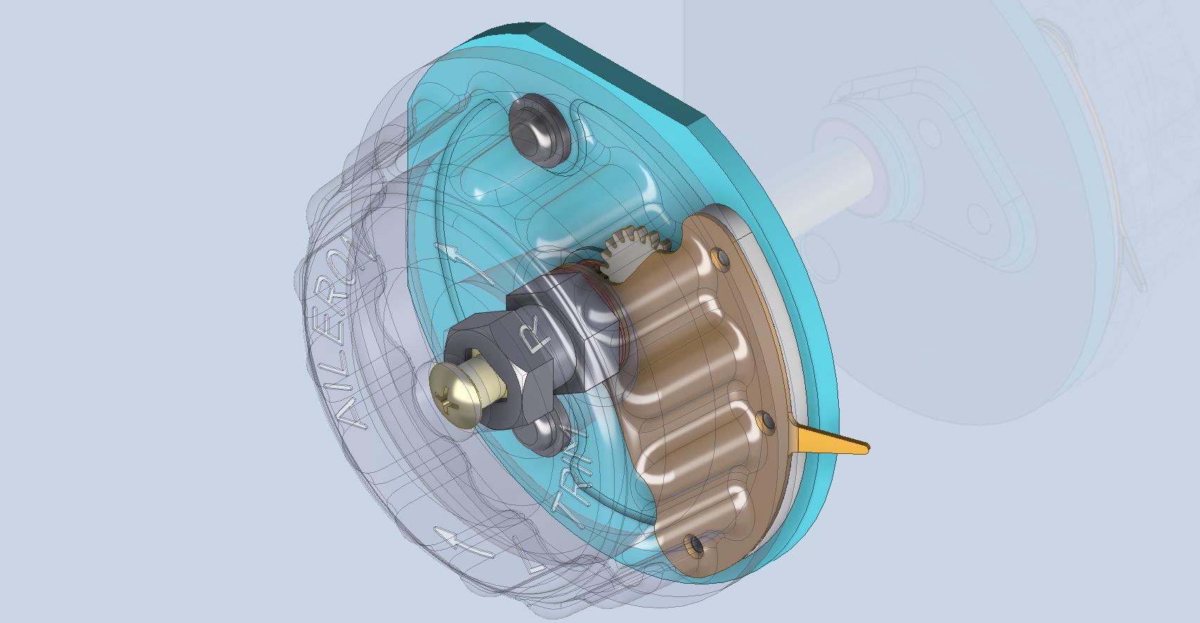 The dials for the Aileron, Elevator and Rudder are all similar to the CAD model shown. The Elevator and Rudder have cable drums attached to a long shaft for direct cable operation whilst the Aileron has a chain sprocket similar to the P-39 Trim Tab controls.